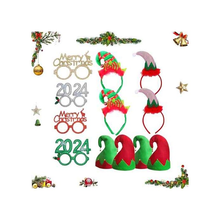 12pcs Gorro Papanoel Duende Elfo con Diademas de Navidad y Gafas de Navidad 2025 para Navidad Año Nuevo 2025 Fiesta Noche Vieja NIño Adulto (PACK DUENDE LUJO)