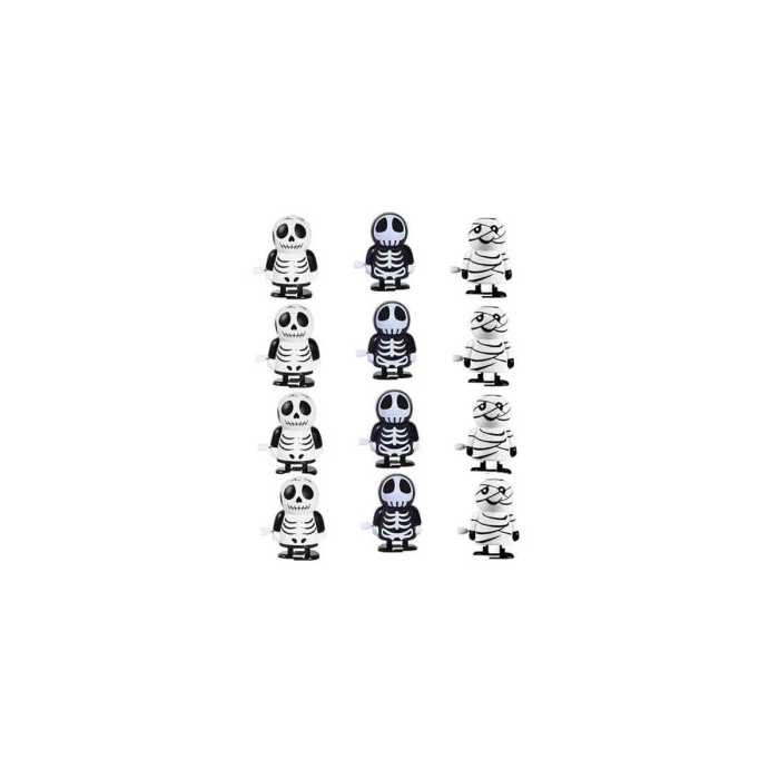 Incluye: Pack de 12 juguetes de cuerda (esqueletos y momias).
