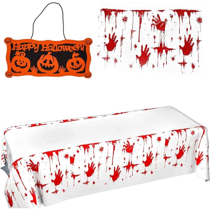 - 【Decoración de Halloween】 Obtendrá un mantel de huellas de manos ensangrentadas y un cartel para colgar en la puerta ''Feliz Halloween'' que cada hogar necesita uno para dar la bienvenida a la llegada de Halloween, lindo y divertido, agregue más atmósfera de fiesta a su fiesta, hágala más animada.
