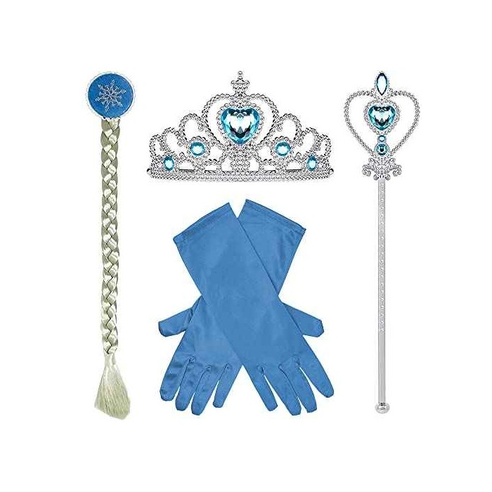Los accesorios de vestir de princesa incluyen: un par de guantes, tiara/corona, peluca de trenza y varita.