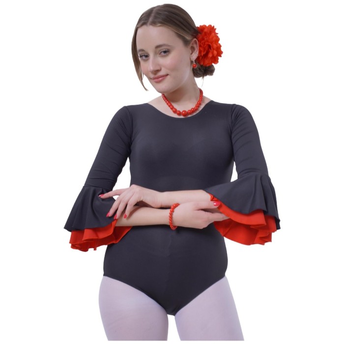 Body flamenco mujer negro maillot danza manga larga con volante, leotardo gimnasia ballet sevillanas, escote redondo, ribete rojo