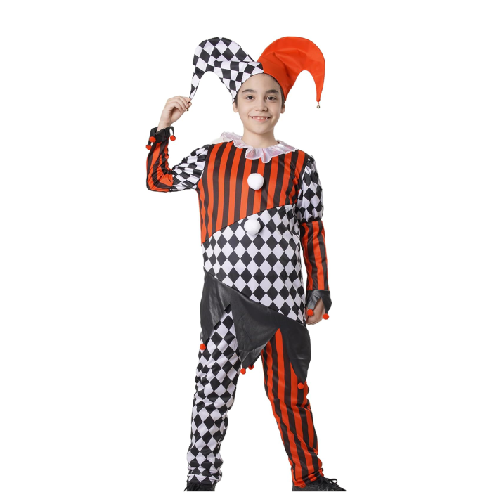 Disfraz Arlequín Niño – Conjunto Rombos Rojo y Negro con Sombrero