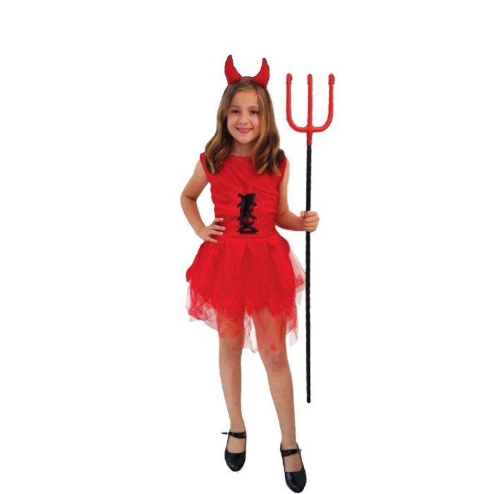 Este disfraz de diablilla para niña combina picardía y estilo con un diseño llamativo y cómodo, ideal para brillar en Halloween o cualquier fiesta de disfraces.