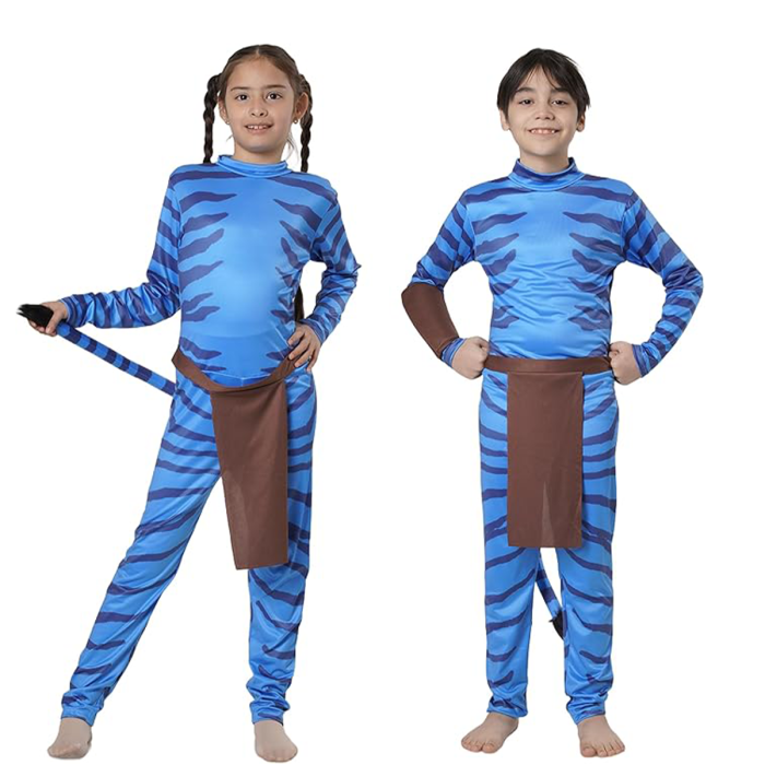 Este traje infantil está inspirado directamente en el “Espíritu Azul de Pandora”, ideal para niñas y niños. Incluye un mono de cuerpo entero estampado en motivos tribales azules, una cola integrada y un taparrabos decorativo que aporta autenticidad y estilo.