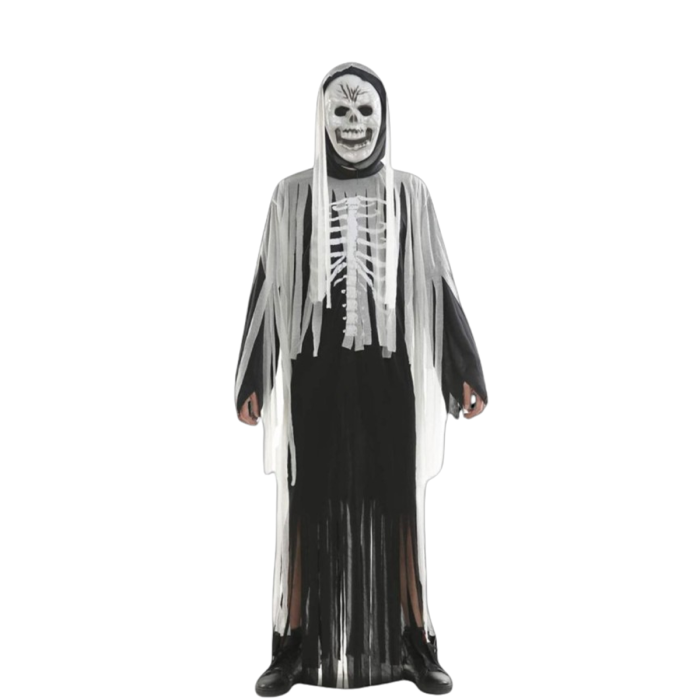 El disfraz está compuesto por una túnica negra con detalles desgarrados que simula un aspecto antiguo y fantasmagórico, además de una máscara de esqueleto realista que completa el look. El diseño es cómodo, ligero y permite moverse con facilidad, mientras mantiene una estética escalofriante y llamativa.