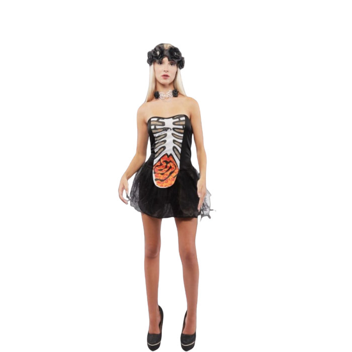 Diseñado para destacar en Halloween o fiestas de terror, este disfraz combina el toque gótico del tul con la estética espeluznante de los huesos impresos en el cuerpo del vestido. El escote palabra de honor y la falda con vuelo gracias al tul inferior lo convierten en una opción sexy, atrevida y temática.
