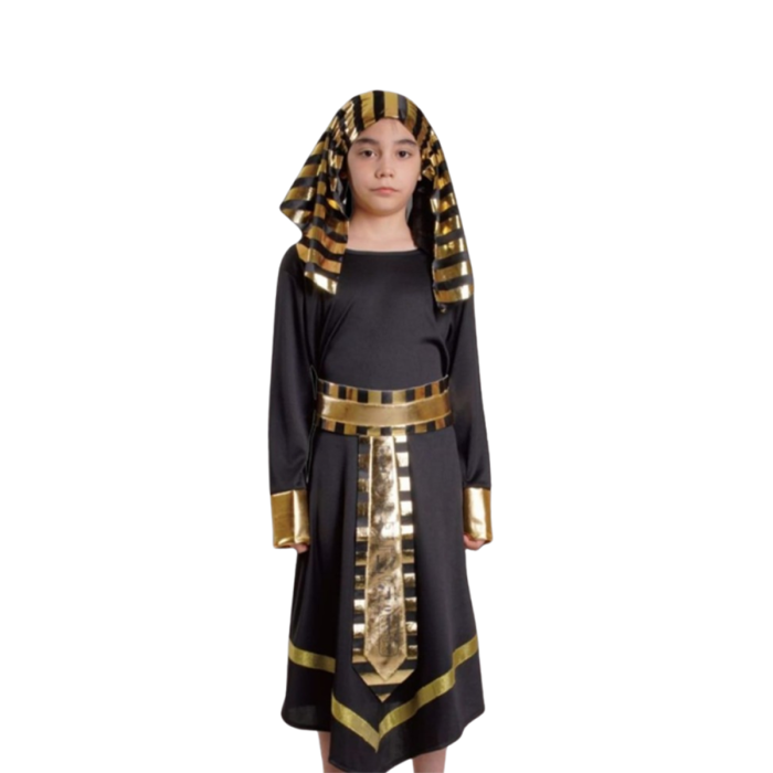 Este disfraz destaca por su túnica negra larga de manga larga, decorada con detalles dorados brillantes y un diseño que evoca la majestuosidad de los reyes egipcios.