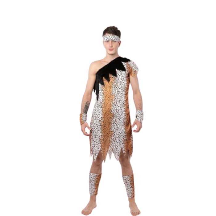 Este disfraz de cavernícola para hombre incluye una túnica de diseño prehistórico, complementada con muñequeras y tobilleras a juego para un look totalmente auténtico. El vestido de estampado animal está confeccionado en tela elástica con detalles en piel y pelo sintético, lo que aporta una textura única y realista que te transportará a la Edad de Piedra.