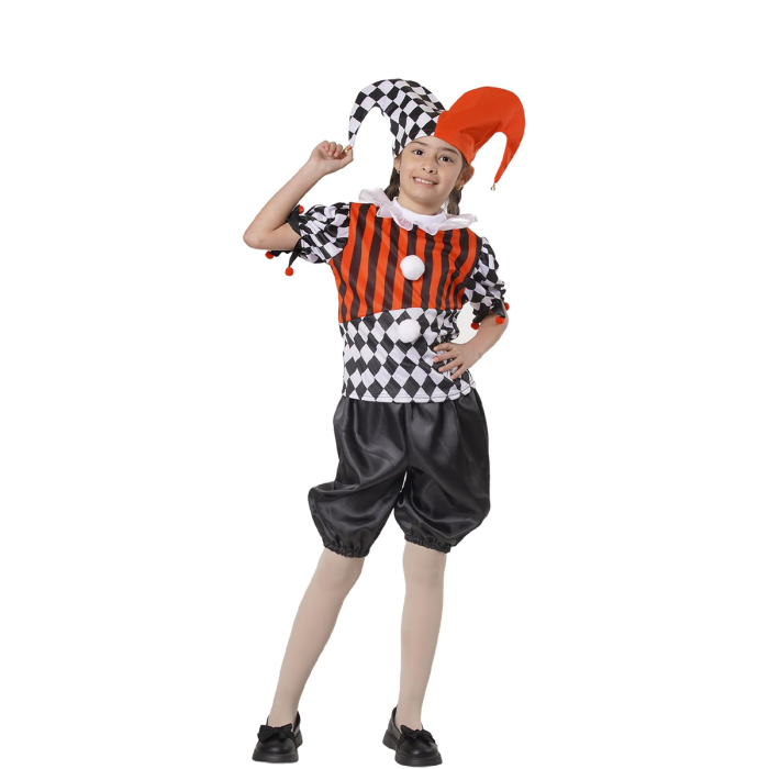 Este traje combina el encanto del estilo bufón con un diseño cómodo y llamativo. El traje es de una sola pieza, con estampado de rombos en rojo y negro, mangas abombadas, cuello con volantes y detalles decorativos que imitan los trajes teatrales de época.