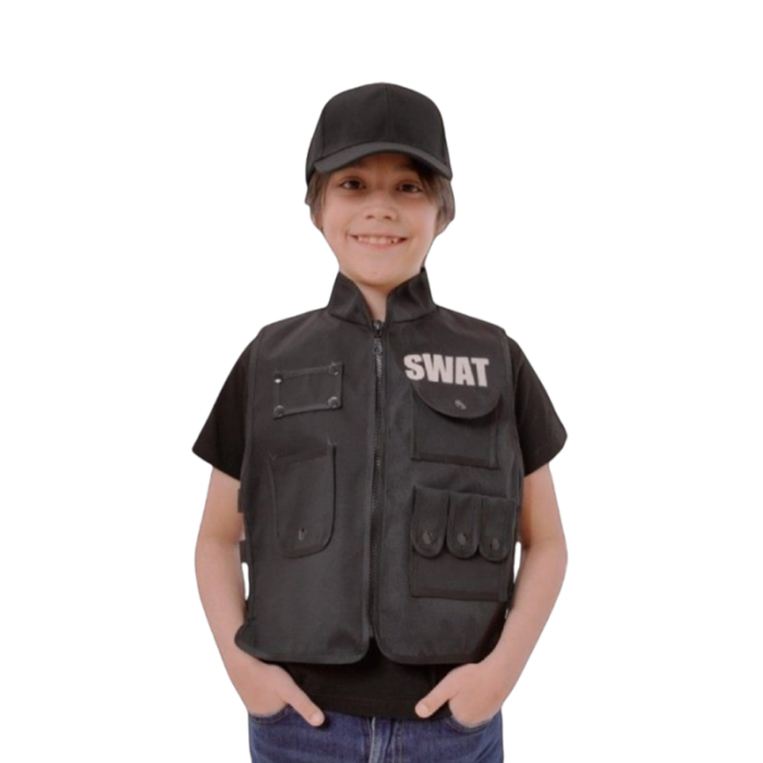 El disfraz incluye un chaleco táctico con bolsillos funcionales y detalle “SWAT” en el pecho, que completa el look profesional. Ligero y cómodo, permite que los niños disfruten de sus aventuras sin restricciones y con total seguridad.