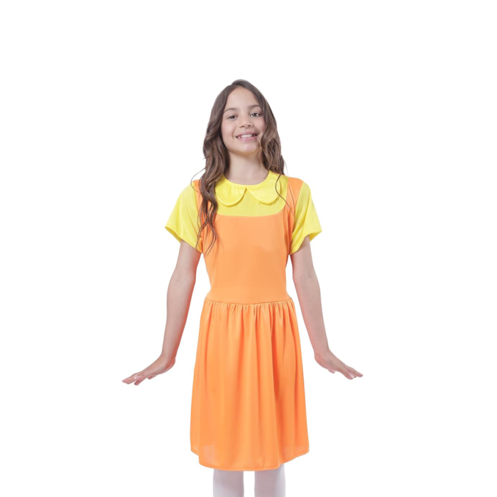 Descubre nuestro disfraz inspirado en la icónica muñeca del Juego del Calamar. Perfecto para fiestas temáticas, Halloween o cosplay, este vestido de una sola pieza en tela ligera presenta un diseño auténtico con blusa amarilla de cuello redondo y falda naranja plisada. Disponible en diferentes tallas para niñas.