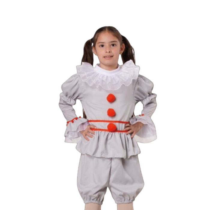 Este disfraz de payasa terrorífica para niña, inspirado en el famoso personaje Pennywise, es la elección perfecta para un Halloween inolvidable o cualquier fiesta temática que pida un toque de terror con estilo.