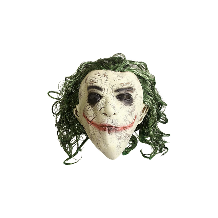 Su diseño realista combina maquillaje siniestro con triángulos verdes en los ojos, piel envejecida, nariz roja y cabello largo bicolor verde y negro integrado en la pieza.