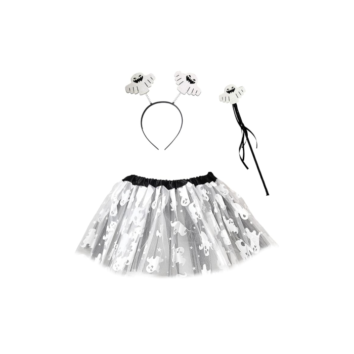 Haz que la diversión y la ternura se apoderen de cualquier fiesta con este encantador pack de disfraz infantil de fantasmas que incluye un tutú de tul de 30 cm, una diadema a juego y una varita mágica decorativa. Perfecto para Halloween, carnaval, fiestas escolares o juegos de fantasía, ideal para niñas que adoran los disfraces divertidos y originales. El tutú combina colores clásicos con estampados de fantasmas que crean un efecto encantador y festivo. Su goma elástica en la cintura permite un ajuste cómodo y flexible adaptándose a varias tallas infantiles. La diadema completa el conjunto con detalles simpáticos de fantasmas mientras que la varita aporta un toque divertido y mágico que hará que las niñas se sientan protagonistas de su propia historia.
