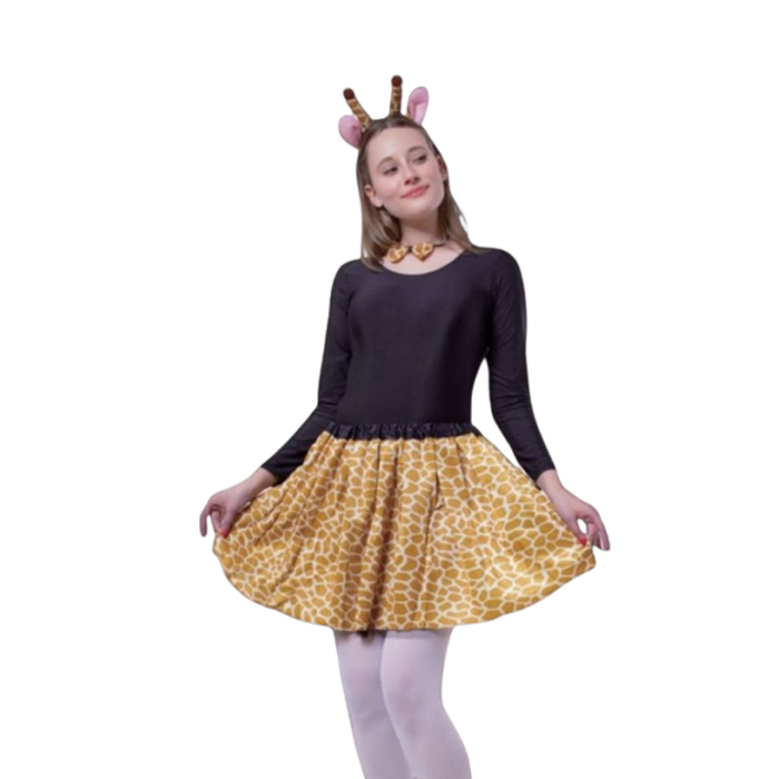 El pack incluye una falda con estampado de jirafa, una diadema con orejas y cuernos y una pajarita a juego, logrando un look animal print elegante y divertido al mismo tiempo.