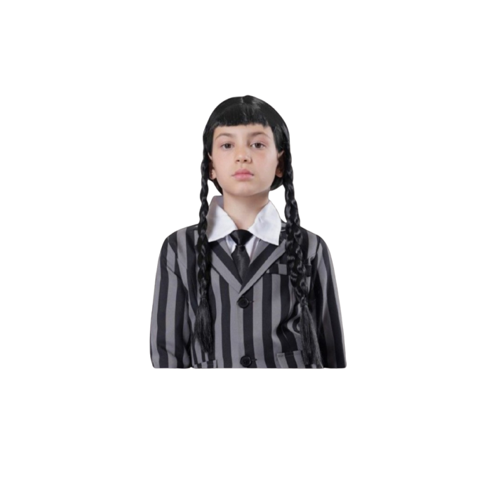 Peluca infantil con trenzas negras inspirada en el estilo clásico de Miércoles Addams. Ideal como accesorio para disfraces de Halloween, fiestas escolares, obras de teatro o eventos temáticos. Fabricada en fibra sintética ligera y resistente, esta peluca cuenta con dos trenzas largas y un flequillo recto característico que aportan un toque auténtico al disfraz. Su interior elástico permite un ajuste cómodo y seguro, adaptándose fácilmente a la cabeza de niñas. Perfecta para completar el look gótico y divertido de uno de los personajes más queridos de la familia Addams. Talla única infantil.