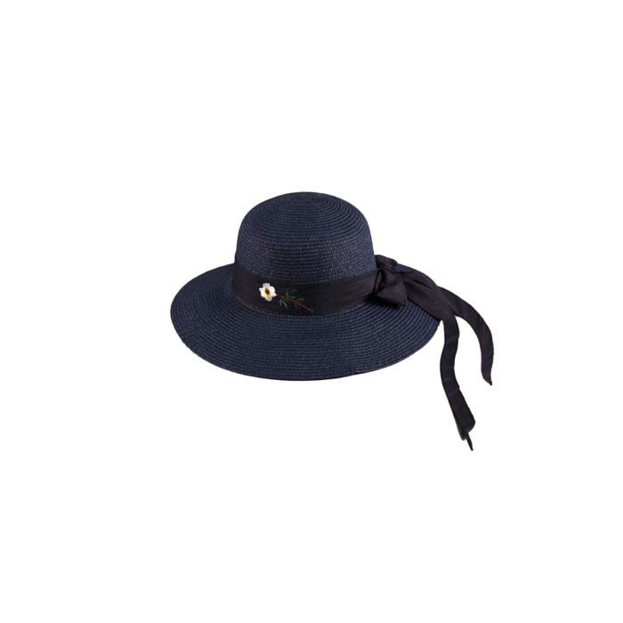 La cinta elegante rodea la copa del sombrero e incluye un bordado delicado de margarita, que aporta un detalle floral romántico y natural.