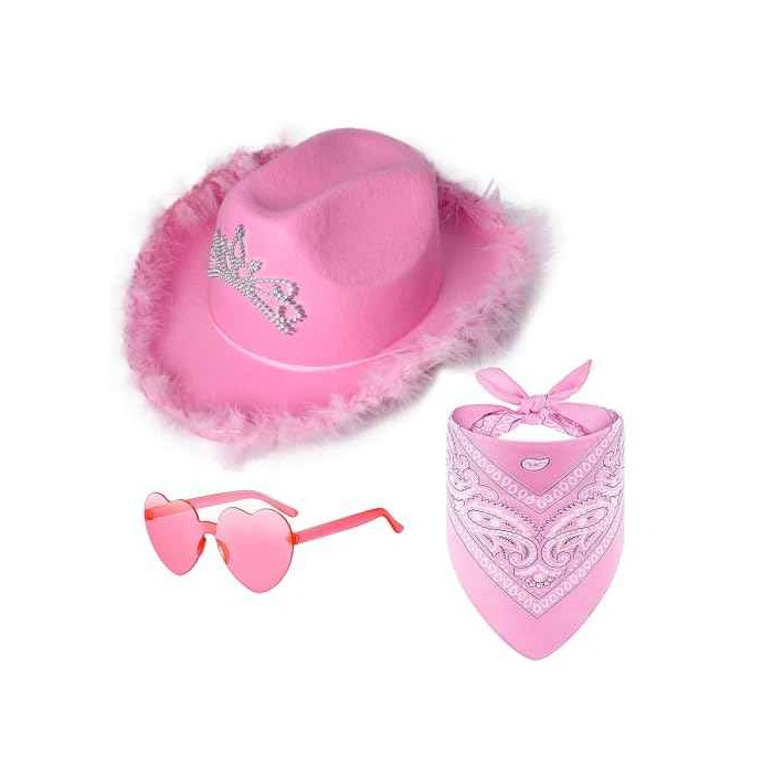 【DISEÑO FANCY Y ORIGINAL】El conjunto incluye 1 sombrero de cowgirl vaquero con corona de princesa y plumas en el borde del gorro+1 bandana estampado algodon+1 gafa de corazones.